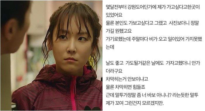 하지만 주말마다 비가 오거나 일이 생겨 가지 못하게 된 이들. 심지어 날이 좋은 때에도 남친은 “차 막히는 거 안 보이냐”라고 핀잔을 주기 일쑤였다. 분명 본인도 함께 가길 원했음에도 불구하고 늘 이런 반응이었다.