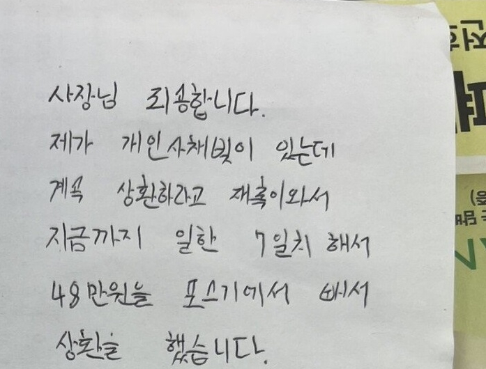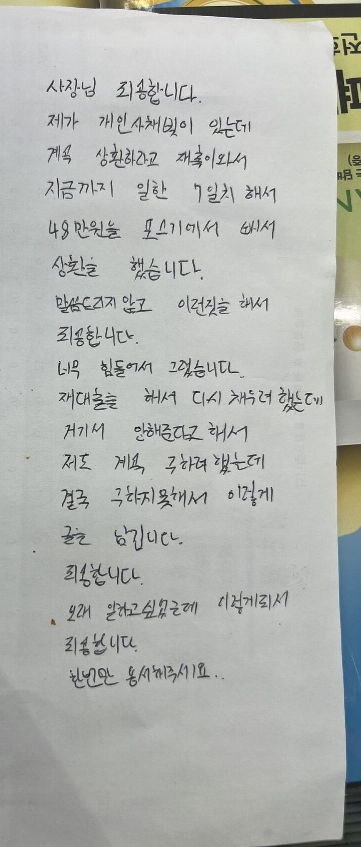 편지까지 남겨서 자기 9월 근무일수 총 7일분인 48만원을 가져가겠다고 갔는데