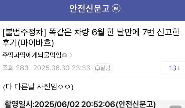 똑같은 차량 한 달에 7번 신고한 후기