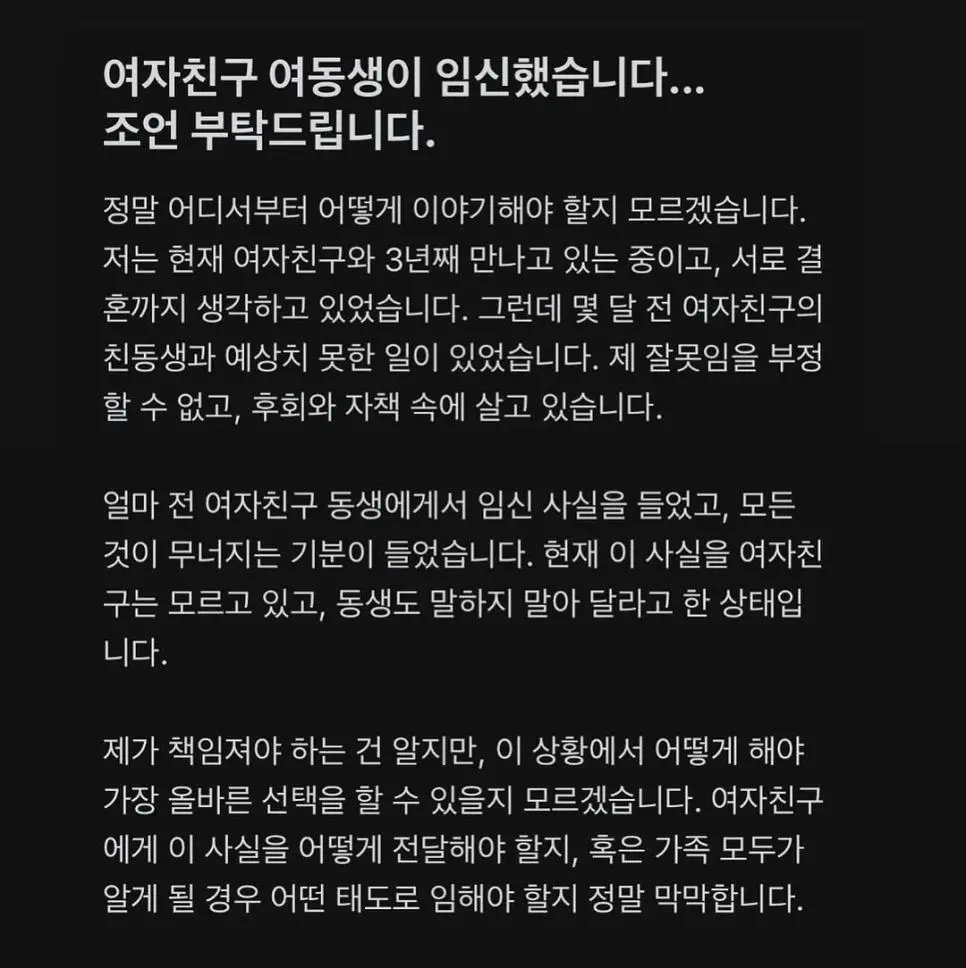 얼마 전 여자친구 동생에게서 임신 사실을 들었고, 모든 것이 무너지는 기분이 들었습니다. 현재 이 사실을 여자친구는 모르고 있고, 동생도 말하지 말아 달라고 한 상태입니다.