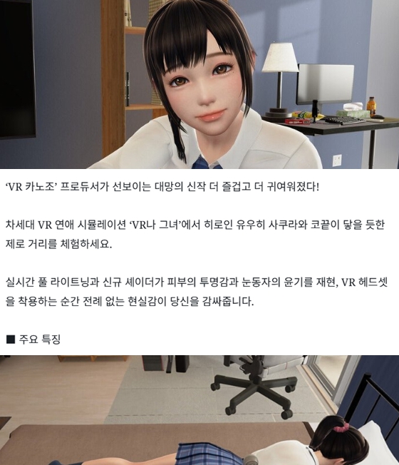 차세대 VR 연애 시뮬레이션 ‘VR나 그녀’에서 히로인 유우히 사쿠라와 코끝이 닿을 듯한 제로 거리를 체험하세요.