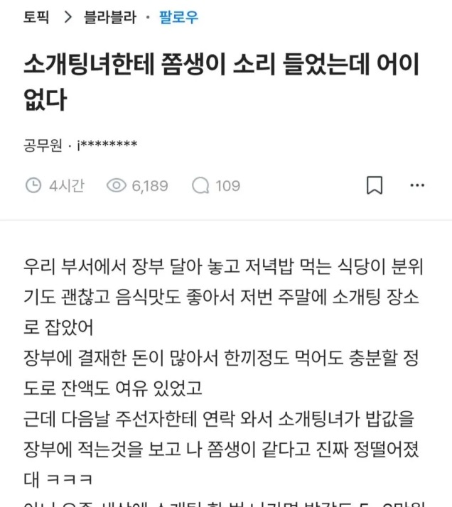 소개팅녀에게 쫌생이 소리 들었는데 어이 없다