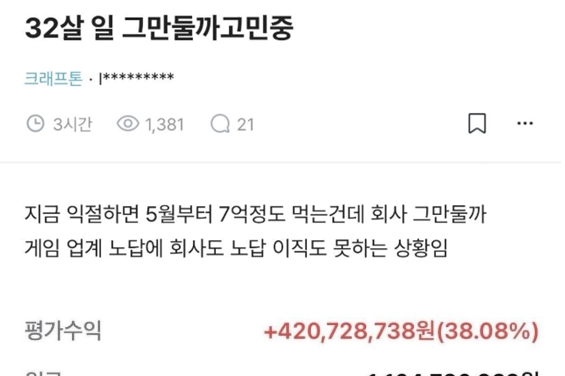 32살에 18억을 벌어서 퇴사 고민 중인 직장인