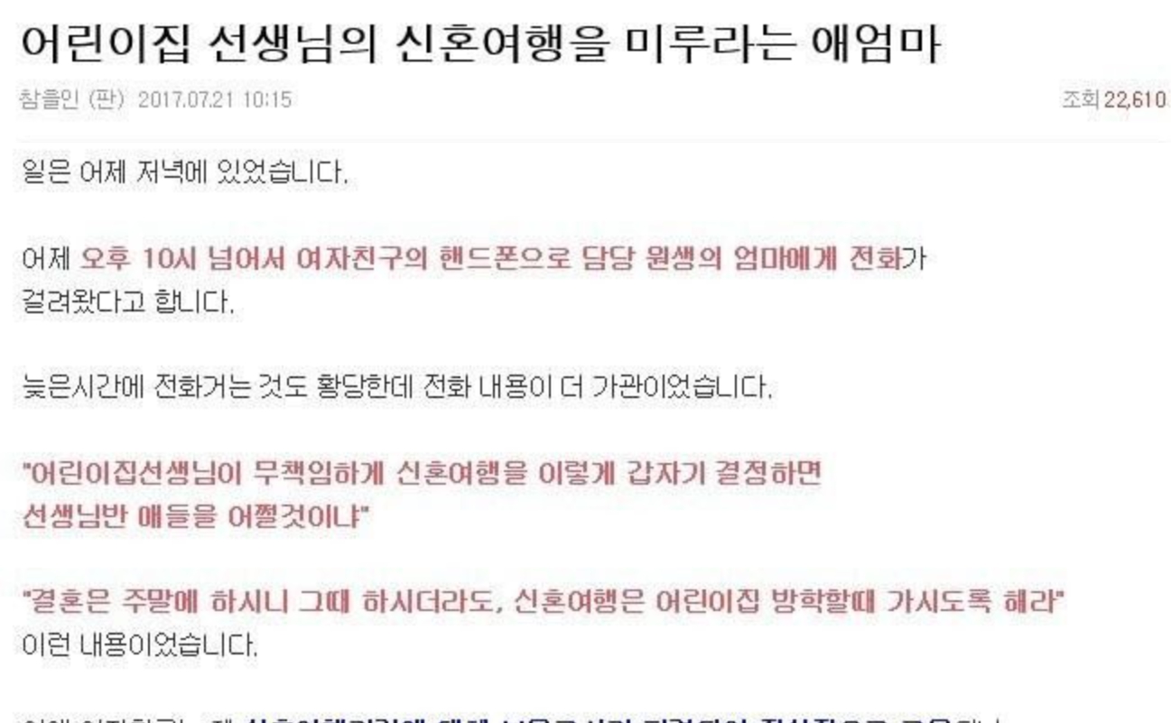 어린이집 선생님 신혼여행 미루라고 한 유치원 애엄마