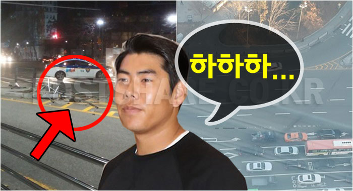 강정호의 음주사고 현장으로 추정되는 해당 사진 속에는 가드레일 등 주위 기물이 처참히 파손된 모습이 고스란히 담겼다. 또한 사거리 교통상황이 사고로 인해 마비된 듯한 모습까지.