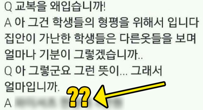 해당 질문에 대해 온라인 커뮤니티에는 명쾌한 답이 올라왔다. 학생들이 교복을 입어야 하는 이유는 ‘형평성’을 위해서라는 것.