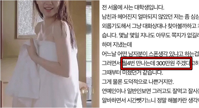 그리고 얼마 지나지 않아 문제의 그 남자로부터 “스폰 생각 있냐. 월 4번에 300만원”이라는 제안을 받게 되었다.