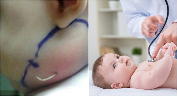 아기의 볼을 ‘깃털’이 뚫고 나왔다고 한다.