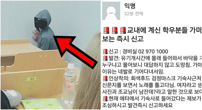 특히 한 누리꾼은 “수업시간에 몰래 들어와서 바닥에 기어 다니다가 발견한 조교님이 누구냐고 물어보니 대답하지 않고 도망쳤다”라며 “현재 기숙사로 들어갔다는 제보가 올라왔으니 학우분들은 조심하시고 발견 즉시 신고하세요”라고 경고했다.