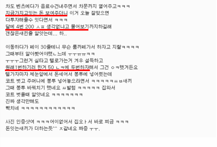 글쓴이는 ‘벤츠를 탄 남성이 현금을 보여주고는 한 달에 4번 파트너가 되어주면 200만 원을 준다고 했다”면서 “룸카페 가자는 걸 힘들게 모텔로 가기로 설득했다”라고 글을 시작했다.