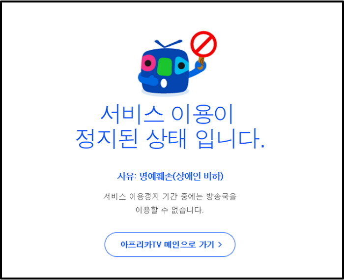 현자 철구의 아프리카TV 페이지에 접속하게 되면 ‘명예훼손'(장애인 비하)으로 서비스 이용이 정지된 상태라는 문구가 나오며 철구가 방송을 할 수 없는 상태라는 걸 안내하고 있다.
