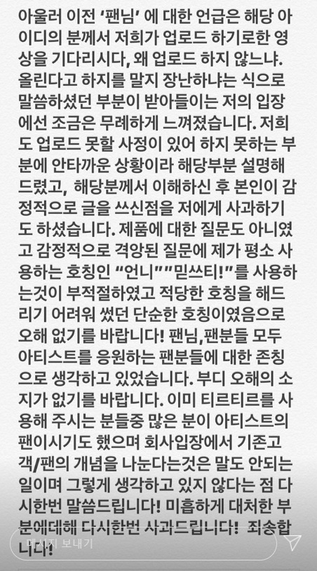 이어 “이전에 ‘팬님’에 대한 언급은 그분이 ‘영상 왜 안 올리냐. 그럴 거면 하지 말지. 장난하냐’라고 말해서 무례하게 느껴졌다.