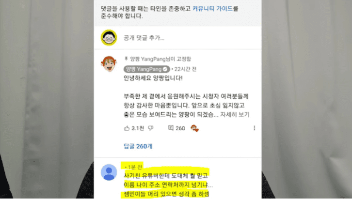 그는 “양팡 채널 댓글 창에서 새로 고침을 누를 때마다 안 좋은 댓글은 사라지고 양팡 편드는 댓글만 보인다”라며 의혹을 제기했다. 특히 양팡 영상의 ‘좋아요’ 개수보다 ‘싫어요’ 개수가 더 많은데 댓글은 좋은 내용만 있다고 지적했다.