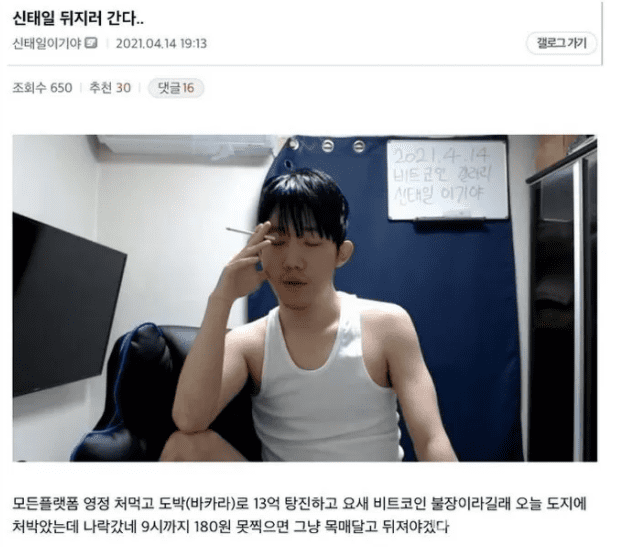 해당 글에는 신태일로 추정되는 글쓴이가 최근 비트코인으로 13억을 탕진해 극단적인 선택을 암시하는 듯한 글을 남겼다.