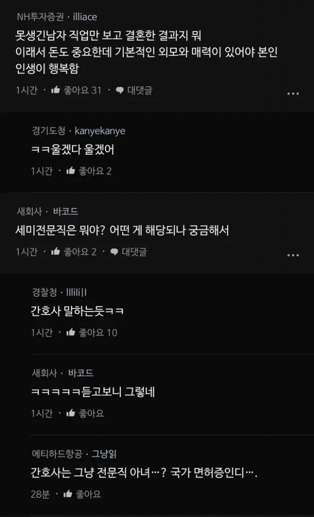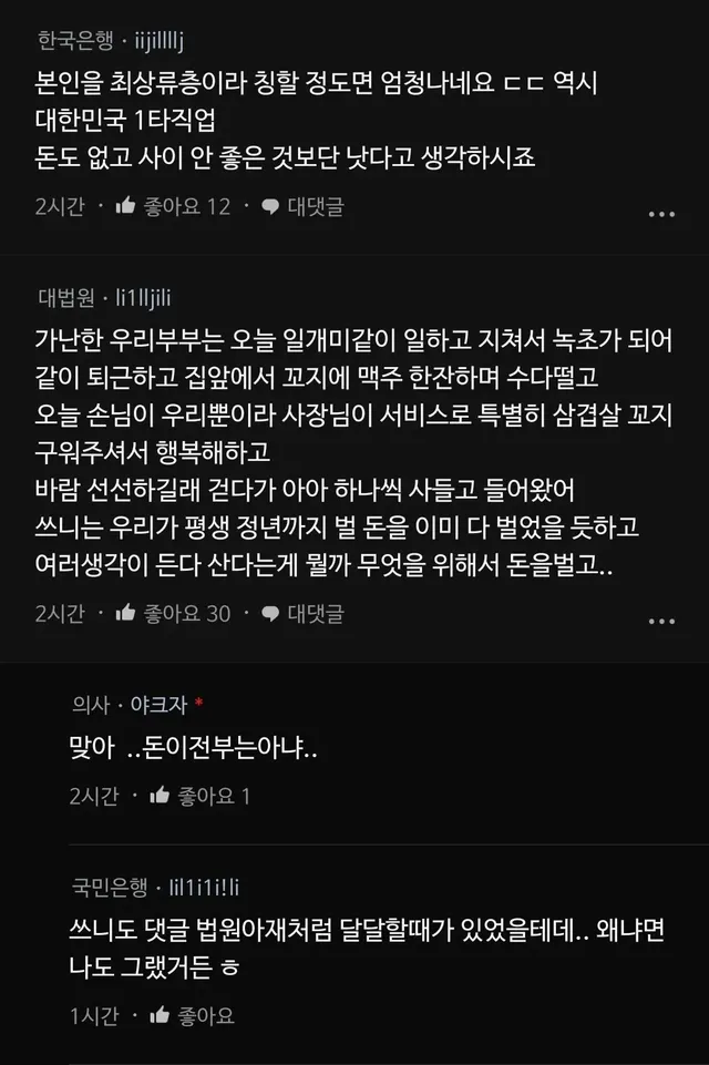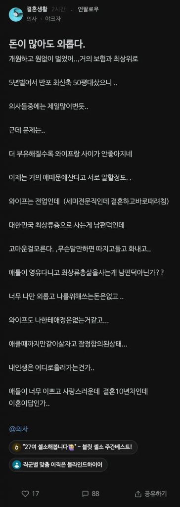 작성자는 아내를 세미전문직이라 표현하며, 경제적으로 큰 기여를 하지 않는 상황에서 본인이 가족을 위해 헌신하고 있다는 점을 강조했다. 그러나 정작 돌아오는 것은 냉랭한 태도와 화를 내는 반응뿐이라고 한다. 아내와의 관계는 이제 거의 ‘애 때문에 산다’는 말까지 나올 정도로 악화되었고, 함께 아이들이 성장할 때까지만 함께 살기로 암묵적으로 합의한 상태라며 깊은 한숨을 내뱉었다.