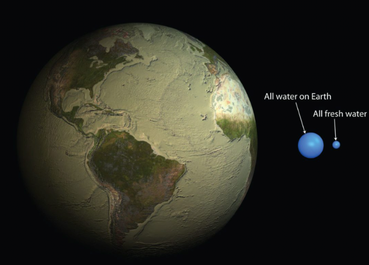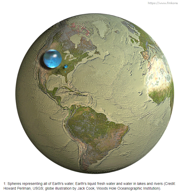 그림 속의 가장 큰 구체는 지구 전체의 물을 의미하며, 그 옆의 작은 구체는 우리가 쉽게 사용할 수 있는 담수의 양을 나타낸다. 우리가 마시고 사용하는 물의 양은 지구 전체의 물에 비하면 극히 미미한 수준이다.