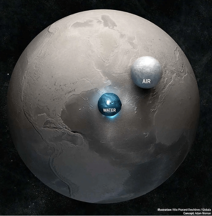 1. 지구의 모든 물을 한데 모으면? 위의 첫 번째 이미지는 지구상의 모든 물을 한데 모았을 때 그것이 얼마나 작은 부피를 차지하는지를 보여준다. 거대한 지구 위에 비교적 작은 구체가 떠 있는 이 사진은, 우리 행성의 바다가 차지하는 면적이 넓을지언정, 전체 부피로 보면 생각보다 크지 않다는 점을 시각적으로 강조한다.