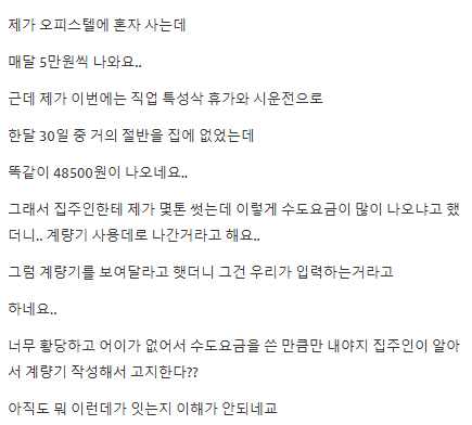 그러나 A씨는 납득할 수 없었다. 직접 계량기를 확인해 보고 싶다고 요청했지만, 집주인은 “그건 우리가 입력하는 것”이라는 모호한 답변을 내놓았다. 수도 사용량이 정상적으로 측정된 것인지, 혹은 오피스텔에서 일괄적으로 부과하는 요금 방식이 문제인지 명확한 해명이 부족한 상황이었다.