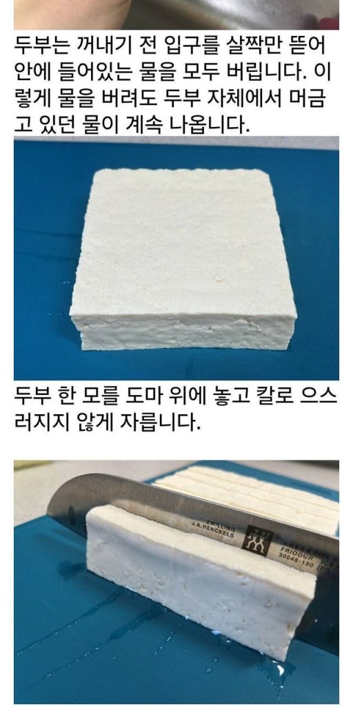 두부를 개봉하기 전에 입구를 살짝 열어두고 내부에 있는 물을 미리 제거합니다. 이렇게 하면 불필요한 수분이 최소화됩니다.
