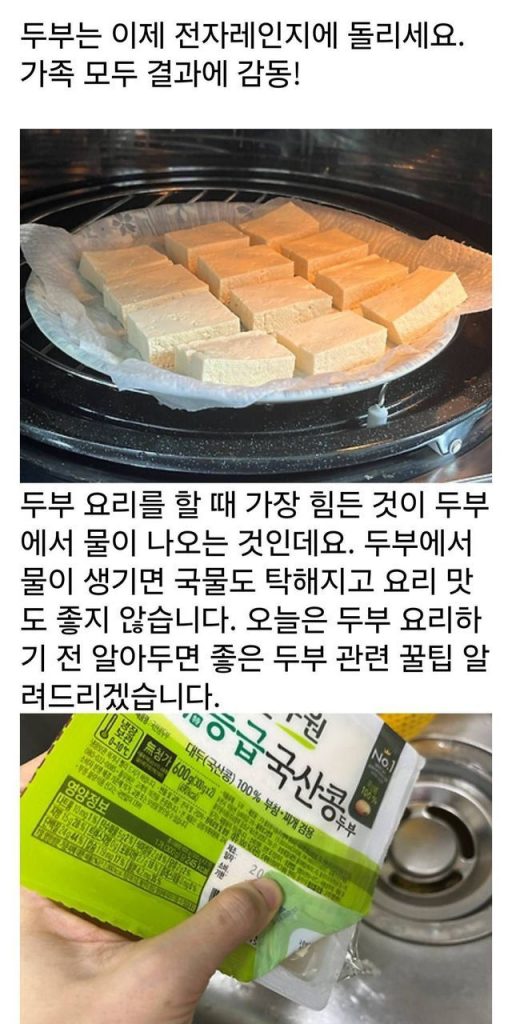 두부 요리를 할 때 가장 어려운 점 중 하나는 바로 수분 제거입니다. 두부에서 나오는 물이 많으면 요리의 식감이 무너지고, 국물이 탁해져 맛도 떨어지기 때문입니다. 하지만 간단한 방법으로 두부를 더욱 단단하고 쫀득하게 만들 수 있습니다. 그 비법은 바로 전자레인지를 활용하는 것입니다.