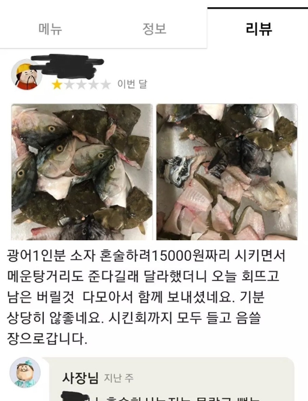 광어 1인분 시켰는데 매운탕거리 20인분 보낸 횟집