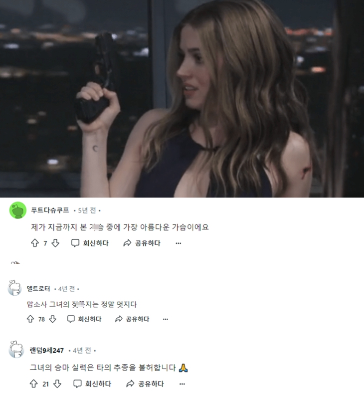 필모그래피에서 엄청나게 많은 노출씬 중에 임팩트가 가장 쎄서인지 해외 커뮤에서는 많이 언급되는 베드신인데 국내에서는 VOD 수입되면서 편집된 장면.
