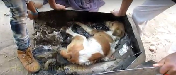 타르 가득 담긴 드럼통에 빠져 몸이 굳어버린 강아지 (사진, 동영상)